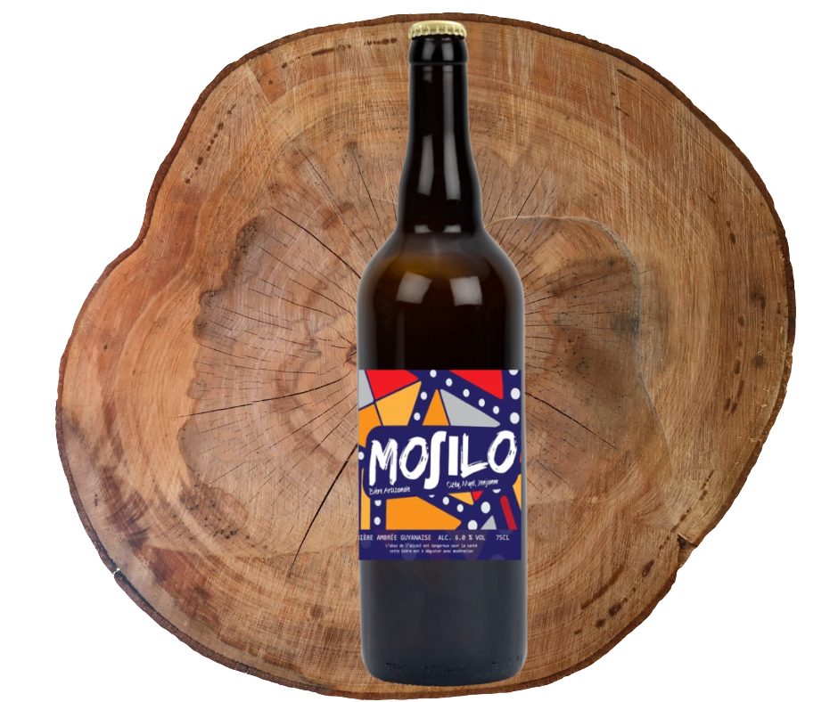 C’est une bière ambrée typiquement guyanaise, dont le nom Kali’na Mosilo signifie entraide et solidarité. Au nez on perçoit des arômes de malt intenses. En bouche, l’acidité de l’oseille Péyi éveille les papilles, puis le miel et le gingembre caressent le palais en fin de dégustation.